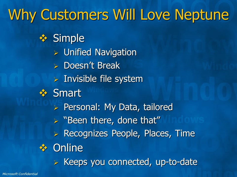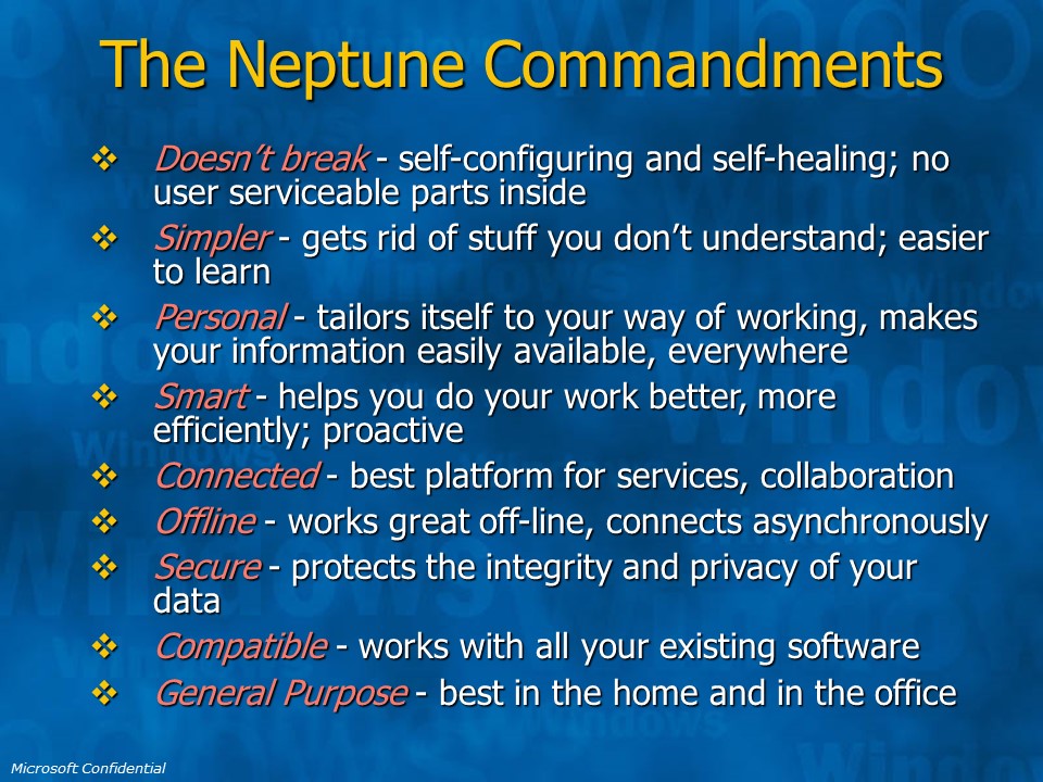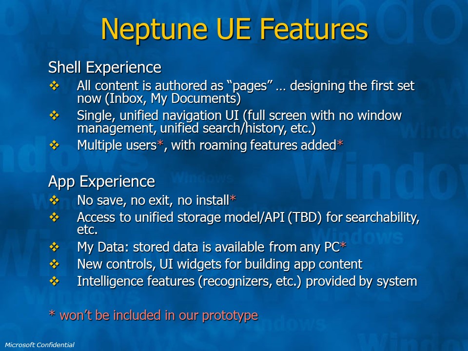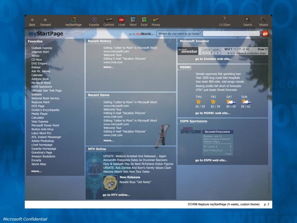 In 1998, I was working on the “RedShark” project to create a new user interface, along with Joe Belfiore, Steve Capps, and a team of ~15 other Microsoft employees. We imagined this could become a “software as a service” called “Neptune” that would supersede Windows. [Obviously, that did not happen…]